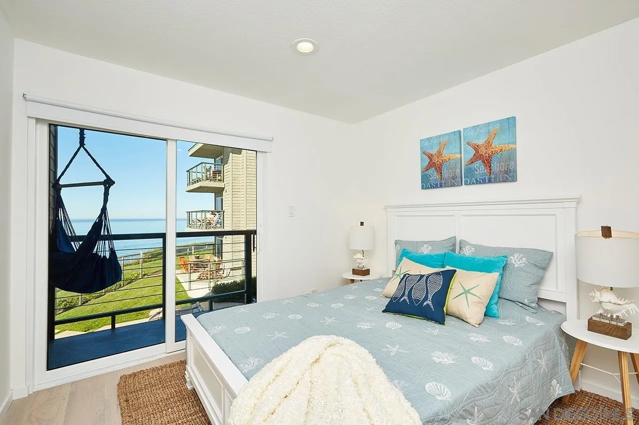 Rare Opportunity! Experience panoramic whitewater & ocean views from this intimate bluff-front complex located west of Coast Hwy 101! This spacious, & beautifully remodeled 2 bed/2 bath residence offers stunning views from primary living area & primary bedroom, plus the two ocean view decks! In-unit washer/dryer is added bonus! Upgrades include custom chef’s kitchen, designer bathrooms with ceramic tile/ premium Kohler & Moen fixtures, + European brushed oak wood floors throughout. Two side by side parking spaces in secure gated parking area, community pool, spa & laundry. Short stroll to Swami’s (beach park) +shops & restaurants! This beautifully upgraded oceanfront home captures the essence of quintessential Encinitas living in a premier location—just steps to beaches and the vibrant village. Enjoy the feeling of being on permanent vacation with Swami’s and “D” St. beach access nearby + charming cafés, yoga studios, farmers market, boutiques, train station, world-class dining, + Moonlight Beach all within easy walk or bike ride! The spacious single-level floor plan has been fully remodeled with designer finishes, including custom lighted kitchen cabinetry, quartz counters, tile backsplash, stainless steel appliances, and sit-down breakfast bar. Two primary suites each feature lux remodeled bathrooms with tile showers, quartz counters, + premium Kohler and Moen fixtures. One suite includes a private entrance—perfect for guest privacy. Additional highlights include recessed Hyperikon LED lighting throughout and cozy, remote-controlled electric fireplace in living room.