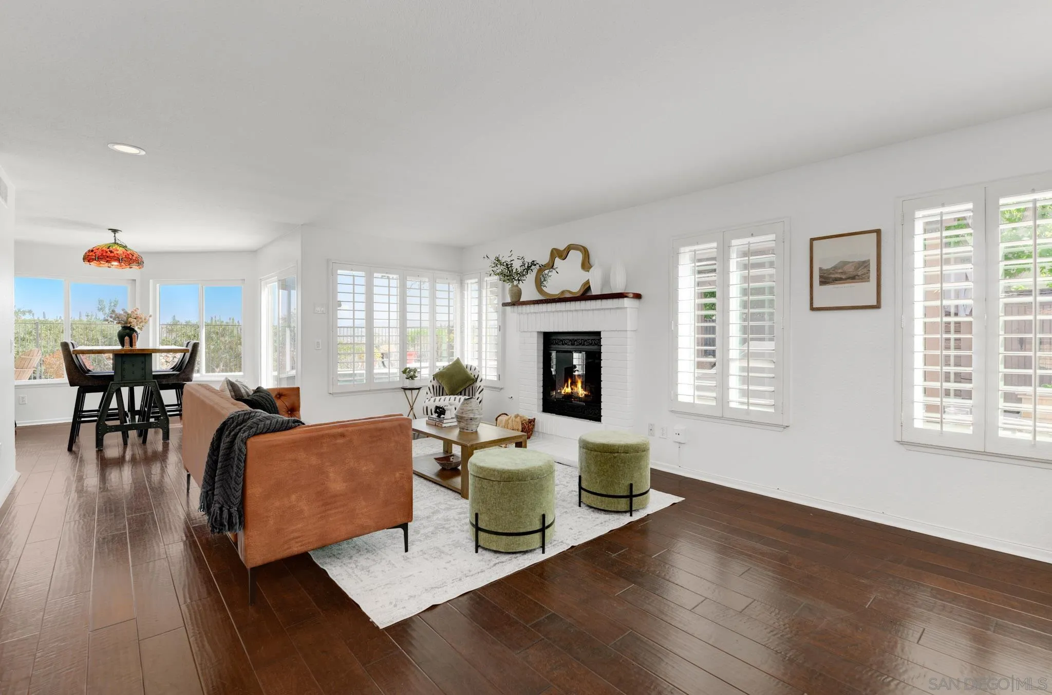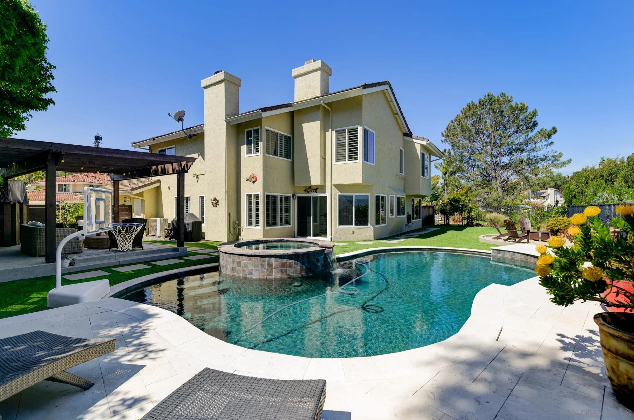 Striking hilltop location in the Terraces at Cantebria with panoramic hillside and mountain views, this beautifully upgraded home offers the perfect blend of comfort, style, and functionality. Thoughtfully renovated inside and out, the property features a newer roof, owned solar, fresh interior and exterior paint, and a fully reimagined outdoor setting with paver driveway and walkways, new landscaping, turf, irrigation, and landscape lighting. The backyard is a true retreat, complete with a stamped concrete patio, pergola, fire pit, putting green, planter beds, and a modern Pebble Tech pool and spa with river rock accents—ideal for entertaining. Located just a few minutes to the beach, this home is true California living at it's finest. Inside, the home is bright and inviting with gorgeous hardwood floors, designer paint, shutters, recessed lighting, dual pane windows and sliders, central air, and a whole house fan. The updated kitchen is complemented by upgraded appliances, while fireplaces in both the family room and primary suite add warmth and character. The recently renovated primary suite features a spa-like bathroom with soaking tub, custom shower, new dual vanity, all-new floor and wall tile, updated lighting and plumbing fixtures, and custom California Closets. Additional highlights include a One Water system, upgraded insulation, newer water heater, epoxy garage floors, and a spacious 3-car garage. Residents enjoy access to community pool, spa, and tennis courts, all just moments from shopping, dining, and everyday conveniences in the heart of Encinitas.