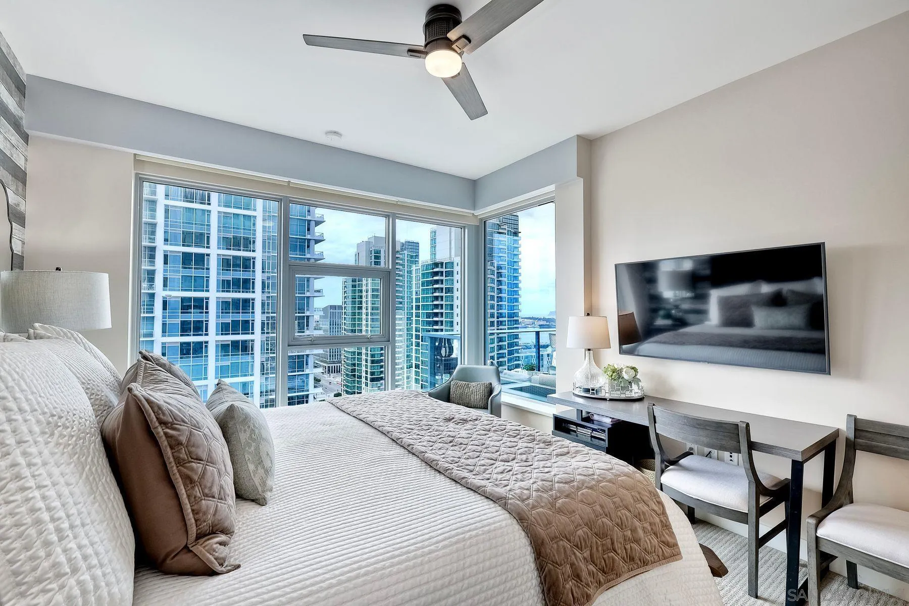 Welcome to Savina #2706, where modern luxury meets coastal urban living in San Diego's premier high-rise community. This exquisite south-facing condo offers awe-inspiring views of the shimmering Bay and Downtown skyline. Bathed in natural light, the residence boasts soaring ceilings and an open floor plan. The modern kitchen is both functional and stylish, featuring ample storage and Thermador appliances. Elevate your living experience with thoughtful upgrades including Lutron automatic shades, custom lighting, designer paint, ceiling fans, a beautifully crafted custom walk-in closet in the primary suite, and a dedicated EV charger in the underground parking space. Savina features over 24,000 SqFt of resort-style amenities, offering a pool and spa, a state-of-the-art fitness center, a yoga deck, social lounge, busines center, outdoor dog relief area, dog grooming room, 24/7 building staff, and wifi included in HOA dues. Located between vibrant Little Italy and the waterfront, residents enjoy proximity to top-rated restaurants, shops, and entertainment venues. Embrace the best of high-rise living at Savina!