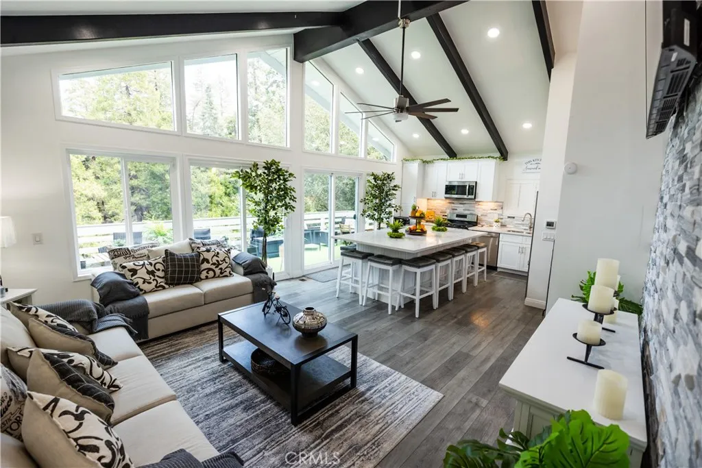 Welcome to this spectacular 3-story cabin with breathtaking views nestled in the quiet hills of Crestline. Located only 3 minutes away from Lake Gregory, this home is perfect for anyone looking to enjoy peace and fresh air year round. This magnificent home boasts an open floor plan with 5 bedroom / 5 bathroom and attached 3-car garage with charging station. You'll be amazed by the beautiful vaulted ceiling in the living room and kitchen with stunning views to the treeline of the mountains. The upgraded kitchen features modern cabinetry, quartz countertops, and stainless-steel appliances. The wrap around deck is perfect for enjoying a morning cup of coffee or entertaining family & friends. The primary bedroom is a true oasis with a walk-in closet, recently upgraded ensuite bathroom complete with a glass door and rain showerhead. Make sure to check out the amazing game room only footsteps away that can be used for endless entertainment possibilities. The lower levels feature a spacious children's playroom, 2 large bedrooms along with upgraded bathrooms. Don't miss out on the opportunity to own this stunning home. Contact us today to schedule a viewing.