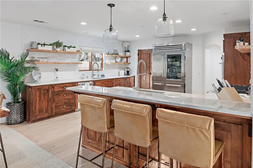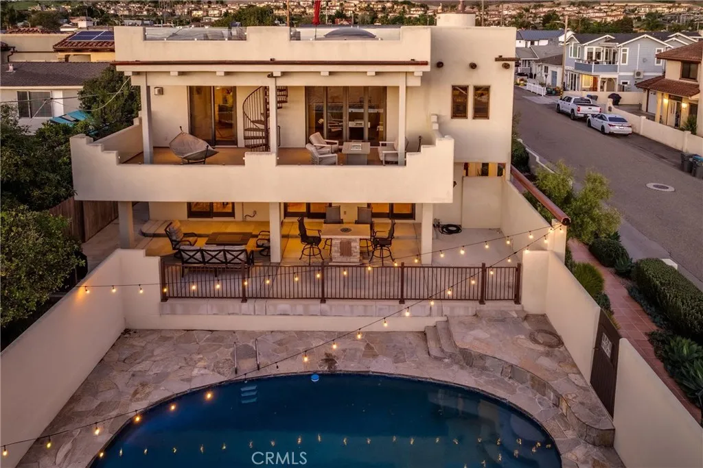 Experience the absolute pinnacle of sophisticated coastal living in this magnificent, fully remodeled 3280 sqft Shell Beach estate. This home presents a striking updated modern aesthetic with clean lines, copper accents, smooth coat stucco exterior walls, and muted tones. Inside, the beautiful European oak flooring spanning the open floor plan, and appointed with custom built-ins throughout offer a cohesive and stylish space. This multi-level masterpiece offers expansive living areas, including a main floor living room, as well as an upper-level family room complete with a full wet barperfect for entertainingwhich opens directly onto an expansive mid-level ocean view deck. The gourmet chef's kitchen features knotty alder cabinetry, quartzite countertops, walk-in pantry, and a suite of top-tier Sub-Zero and Wolf appliances. The home boasts spacious accommodations, including a luxurious owner's suite with fireplace, spa-like bathroom with massive walk-in closet, plus an additional bedroom with its own en-suite bathroom and private balcony, and a separate bedroom downstairs with it's own exterior access. For the ultimate outdoor experience, the upper floor roof deck offers an unparalleled, 360-degree vista of the entire coastline and surrounding landscape. The generous 7,200 sq. ft. lot is an entertainers paradise, showcasing a sparkling swimming pool surrounded by an outdoor entertainment area, plus a highly desirable private 1 bedroom/1 bathroom guest apartment is a great option for rental income or guests coming to visit. Complete with possibly the largest garage in Shell B