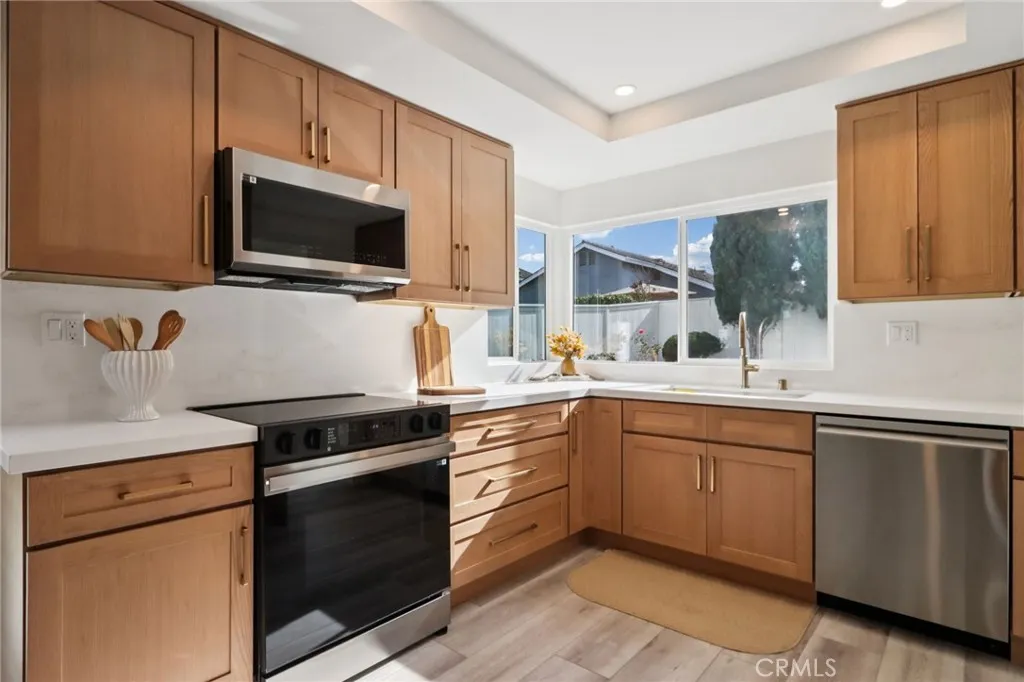 Step into what may be the finest move-in ready home for sale in Woodbridge, a beautifully upgraded 4 bedroom, 2.5 bathroom, 1,852 sq ft residence set in the heart of Irvines most sought after lake community, with resort style amenities just outside your door. Inside, you will find a beautifully remodeled kitchen and bathrooms featuring designer cabinetry, modern hardware, updated mirrors, and stylish lighting. The bathrooms are finished with upscale fixtures including Kohler toilets, designer shower heads, and upgraded drains. The primary suite is a standout, complete with an en suite bath featuring a skylight for abundant natural light and sleek designer shower doors. Major updates continue throughout the home with new windows and fresh interior and exterior paint, including the backyard fence and planters. Flooring has been refreshed with new carpet and durable vinyl plank throughout. The living space offers a unique sunken sitting area anchored by a charming brick fireplace, while volume ceilings, plentiful natural light, and recessed lighting create an open, airy feel. Outside, enjoy a new patio cover and an upgraded curb appeal package featuring a stunning front door, new exterior light fixtures, and a larger locking mailbox. The landscaping is supported by an automatic sprinkler system with new valves and a new front pressure regulator. The spacious garage includes updated plumbing for the washer with new valves and a cabinet for hot and cold water connections. Additional upgrades include scraped ceilings throughout, adding to the clean, updated finish of this excepti