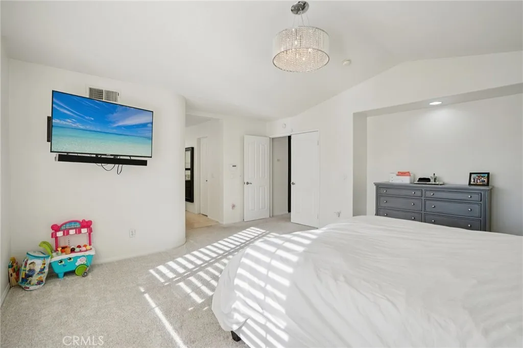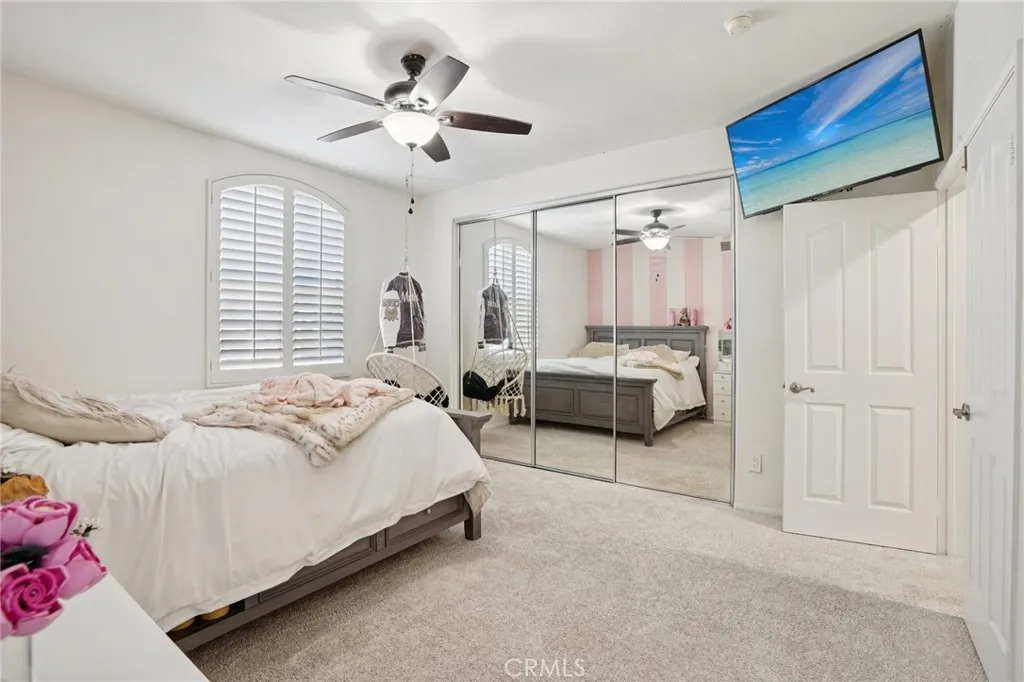 Beautifully maintained family home offering a rare and versatile layout with 2 bedrooms on the main level, ideal for guests, multigenerational living, or a home office with private entry. The main floor features a formal dining room with French doors, a separate laundry room, and an open kitchen equipped with stainless steel appliances, double oven, five-burner gas stove, and included refrigerator. The kitchen opens directly to the family room, creating an easy and connected living space for everyday life and entertaining. Upstairs, the home offers a spacious primary suite along with 3 additional generously sized bedrooms including a Jack and Jill bathroom with dual sinks and a convenient upstairs desk or homework area. Ceiling fans throughout, plantation shutters, indirect lighting, and a mix of tile, wood, and carpet flooring add comfort and style throughout the home. The private outdoor entry features a gated patio that enhances privacy and leads to the front door. One of the downstairs bedrooms includes a separate exterior entrance, offering added flexibility. The backyard is designed for entertaining and relaxation, featuring a resort-style pool and spa that is gated for safety but removable, a covered patio, fire pit, shade bar area, and an elevated viewing deck with built in BBQ, kegerator, and sink. Situated on a quiet private cul-de-sac, the home is close to a community park and located within the highly regarded Mountain View Elementary school district. This property blends space, functionality, and outdoor living in a sought after neighborhood.