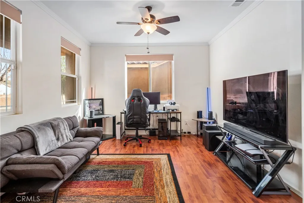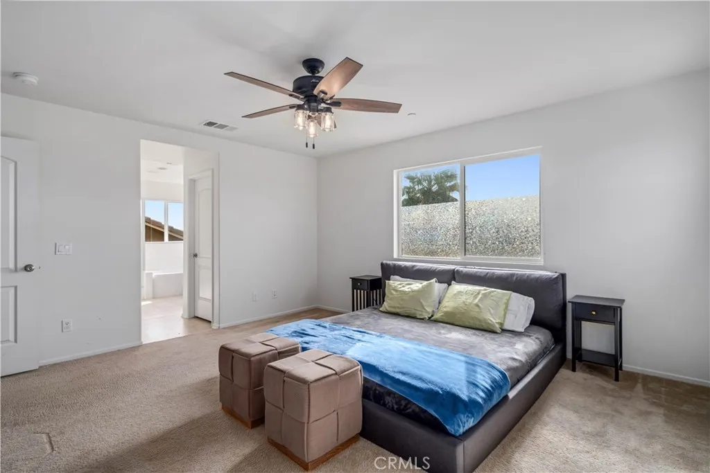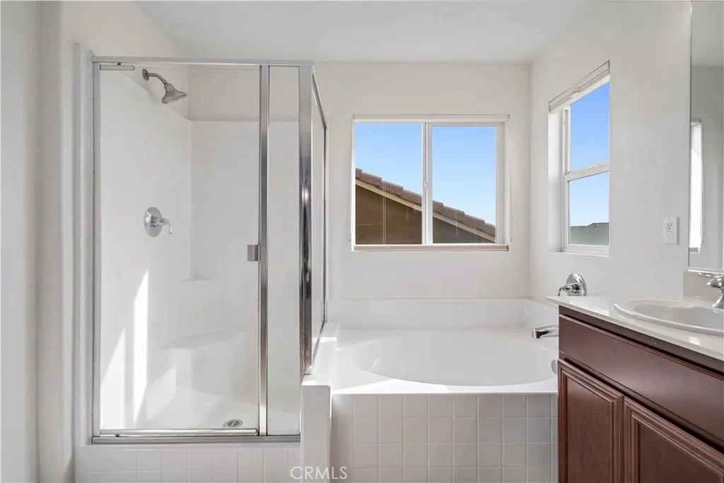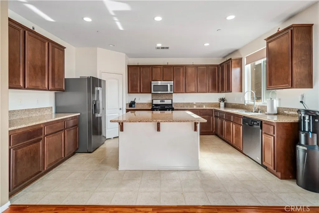 Step into this beautifully designed 5-bedroom, plus office, 3-bath home offering OWNED solar and a tandem 3-car garage. Perfectly blending space and functionality. The main level includes a bedroom and full bathroom, ideal for guests or extended family, along with a private front office featuring double-door entry. The heart of the home is the open and airy kitchen, complete with a center island, stainless steel appliances, walk-in pantry, and abundant counter space, all overlooking the expansive family room with soaring ceilings. A formal dining area provides the perfect setting for gatherings and special occasions. Upstairs, the primary suite offers a true retreat with a spacious walk-in closet and an en-suite bathroom featuring dual sinks, a large vanity, soaking tub, and separate shower. Three additional oversized bedrooms share a thoughtfully designed hall bathroom with dual sinks and a separate tub/shower area. Tandem 3 car garage offers a Tesla charging system. While rear yard is ample in size for all of your needs. With multiple living spaces, energy efficiency, and room to grow, this home checks all the boxes