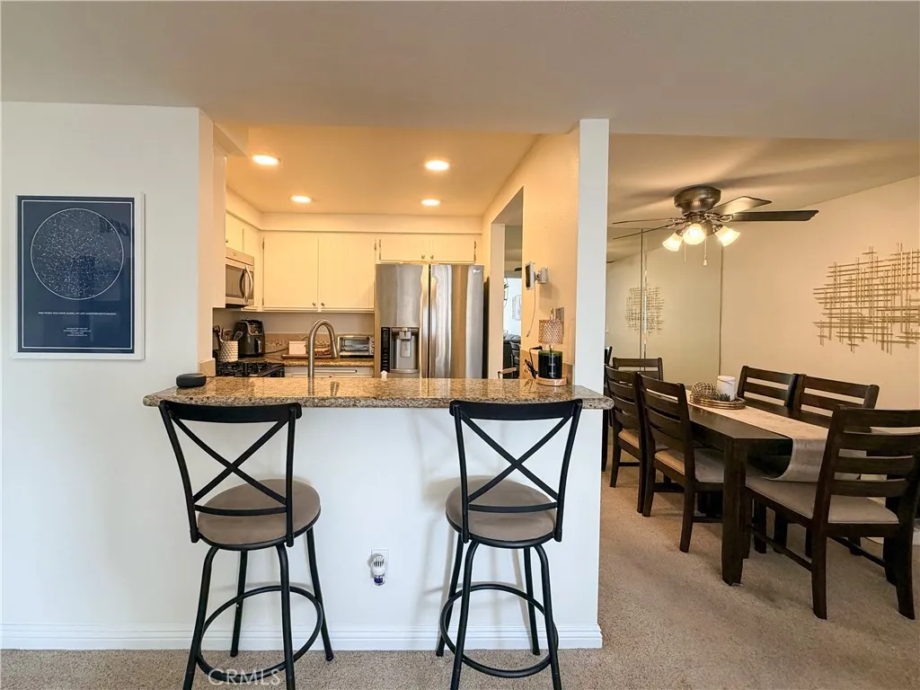 Prime location and move in ready! Charming 2 bedroom, 2 bathroom upper unit in a very desirable community located in the heart of Valencia. Bright and welcoming living room with vaulted ceiling, a cozy fireplace and a slider that leads onto a private balcony perfect for your morning coffee and gorgeous sunset. Ideal for patio dining and outdoor barbecue. For fantastic enjoyment, the kitchen with abundant cabinets, granite countertops, and breakfast bar flows into the dining room. The spacious primary master bedroom features a walk-in closet, bright vanity with dual sinks, and its own bathroom with a step-in shower. The second bedroom offers closet and storage space with views of the balcony. The guest bathroom has a shower/tub combo with plenty of cabinet space. All appliances are included, with door-to-door stainless steel fridge and full-size washer and dryer in unit. This home includes a single-car garage with convenient keypad entry, a designated parking space and access to plenty of visitor parking in close proximity. A resort-like experience is right outside your door thanks to the community's wonderful HOA amenities, which include pools, spas, and exquisitely maintained grounds. Conveniently located walking distance to shopping, dining, scenic paseo walking trails, schools, and parks as well as Valencia Town Center, Henry Mayo Hospital and College of the Canyons. Close access to the near freeways. Don't miss your chance to own a home that offers comfortable living spaces and access to a host of amenities that will enhance your lifestyle!