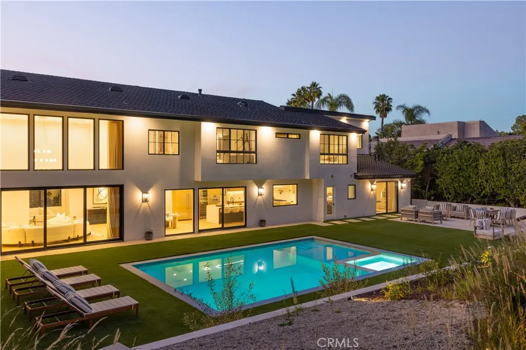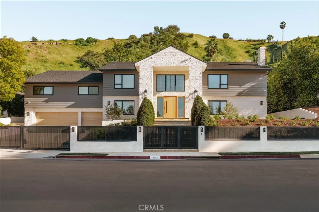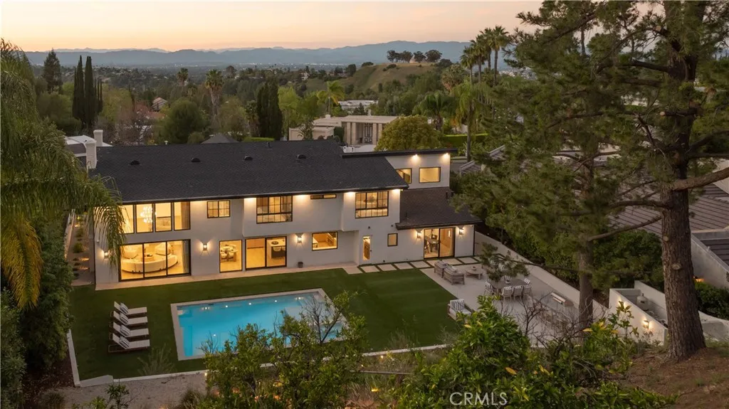 Situated in the coveted hills of Encino, this beautifully redesigned residence offers modern elegance, privacy, and sweeping views. Originally known as the iconic Karate Kid House, featured in the classic film The Karate Kid, the property carries a unique piece of Hollywood history while now showcasing a thoughtfully reimagined modern living experience. A welcoming entry introduces soaring ceilings, a striking staircase, and wide plank wood flooring that flows throughout the home. Generous living and entertaining spaces are framed by large windows that fill the interiors with natural light while capturing lush greenery and scenic hillside vistas. Living areas are anchored by sleek fireplaces, creating warm and inviting environments ideal for both everyday living and entertaining. The gourmet kitchen is thoughtfully designed with custom cabinetry, high end appliances, a large center island with seating, seamlessly opening to the surrounding living and dining spaces. Upstairs, a spacious recreation room with vaulted ceilings and exposed wood beams offers a versatile gathering space perfect for a media lounge, game room, or relaxed family living. The primary suite provides a peaceful retreat, featuring a spa inspired bathroom with a soaking tub, oversized shower, dual vanities, and an expansive walk-in closet. Designed for both entertaining and everyday enjoyment, the backyard offers a true resort like setting with a pool and spa, multiple lounge and dining areas, an outdoor kitchen and BBQ, and lush landscaping that extends up the hillside, creating a private outdoor environm