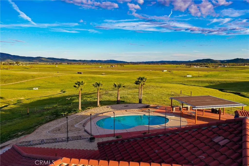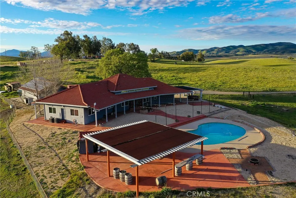 Welcome to an extraordinary private, solar-powered estate overlooking the breathtaking San Antonio Valley, where refined country living meets natural beauty. Set on approximately 40 acres of gently rolling, fully fenced land, this remarkable property offers sweeping views, exceptional privacy, and a serene setting designed for both relaxation and entertaining. The custom residence spans nearly 3,000 square feet and is thoughtfully designed to embrace its surroundings. A charming wrap-around porch invites you to unwind and take in the expansive valley vistas, while the beautifully landscaped, drought-tolerant grounds provide effortless elegance and low-maintenance living. Inside, the home features a spacious and well-appointed split floor plan that balances comfort with privacy. The luxurious primary suite is situated on one side of the home, while guest bedrooms occupy the other, creating an ideal retreat for family and visitors alike. Near the entry, a versatile den offers the perfect space for a home office, library, or media room. At the heart of the home, the expansive chefs kitchen showcases a spacious walk-in pantry and generous breakfast bar that flows seamlessly into the living roomcreating a welcoming space designed for both everyday living and sophisticated entertaining. Step outdoors to experience resort-style amenities designed to elevate everyday living. Enjoy sun-drenched afternoons by the pool and spa or host unforgettable gatherings at the traditional Santa Maria-style BBQ area, a centerpiece for outdoor dining and entertaining beneath the open sky. Completi