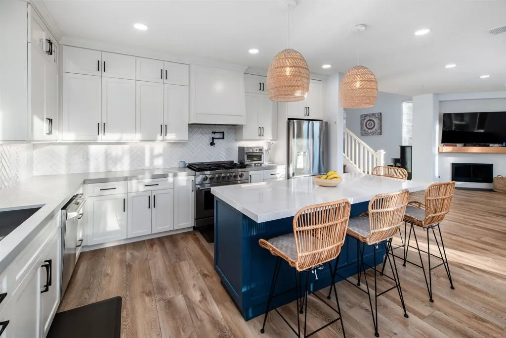 Tucked within the gated community of Mar Brisa, this beautifully upgraded home blends modern finishes, thoughtful updates, and a welcoming neighborhood setting on a peaceful cul-de-sac. With soaring double-height ceilings greeting you at the entry, the home immediately feels open, bright, and airy, enhanced by an abundance of natural light and expansive windows overlooking the backyard. Nearly every detail has been refreshed within the past five years, including a fully remodeled kitchen, luxury vinyl flooring, baseboards and crown molding, interior and exterior paint, doors, recessed lighting, light fixtures, landscaping, turf, and fresh mulch surrounding the home. The stunning kitchen serves as the heart of the home, featuring a quartz slab island, matte grey quartz counters, sleek stainless steel appliances, a 6-burner Kucht range with pot filler, and Kucht microwave, creating a space that is both functional and beautifully designed for everyday living and entertaining. The living room offers a cozy fireplace and an effortless connection to the backyard, where multiple glass doors and windows line the back of the home, filling the space with natural light and creating a seamless indoor-outdoor feel. The yard has been refreshed with new turf and updated landscaping, creating a low-maintenance space perfect for relaxing or gathering with friends. Upstairs, the spacious primary suite feels like a true retreat, complete with a private balcony offering ocean views and unforgettable sunsets. A unique spiral staircase connects the backyard directly to the balcony deck, which fe