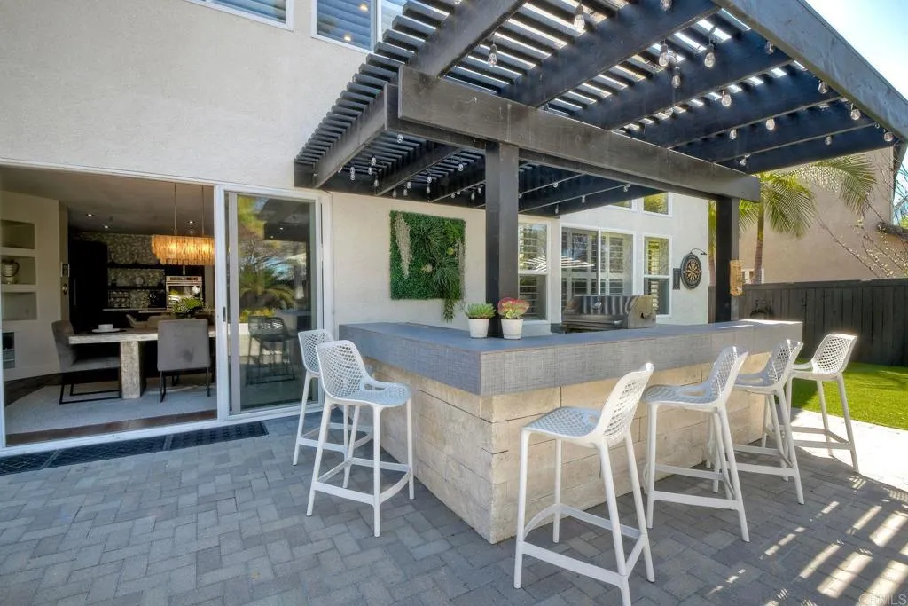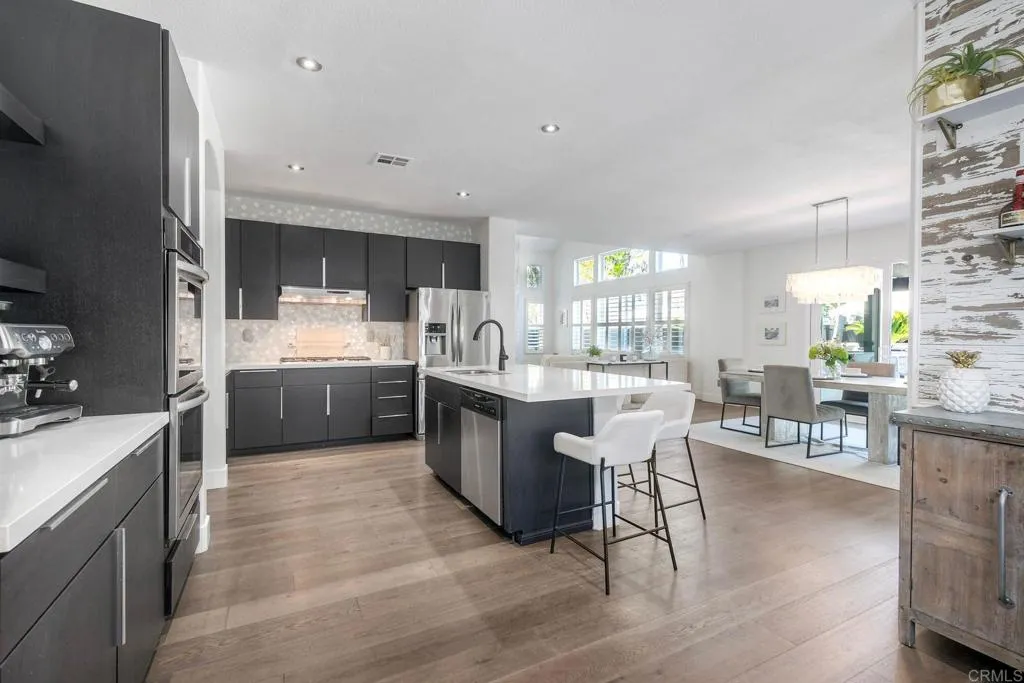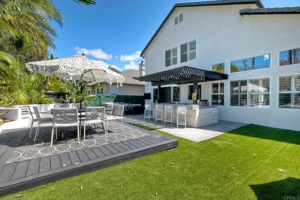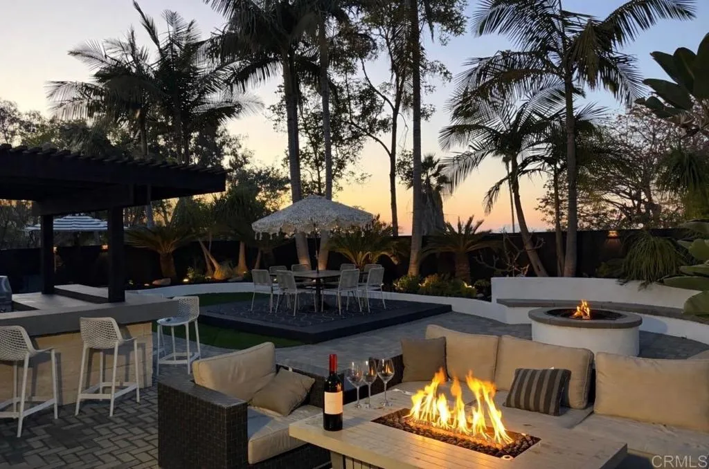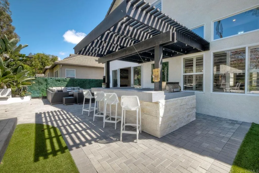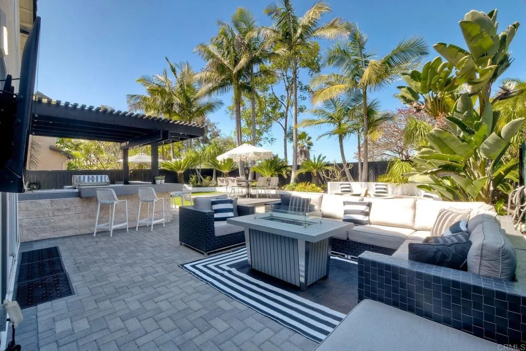 ELEVATED DESIGN MEETS CARLSBAD MODERN COMFORT! Experience the best of coastal Carlsbad in this beautifully upgraded home designed for comfort, style, and entertaining. As you enter this beautifully crafted home, you'll notice oak flooring throughout, and beautifully remolded living area that has been opened to create a bright, modern layout with a structural beam addition; high ceilings centered around a stunning custom-built European style electric fireplace that makes the perfect setting for evening cocktails or just relaxing with family & friend. 1st floor Bonus room allows added space for family or game night. Open kitchen plan features Silestone Island counter & large dinning area that features a custom 4-panel bi-parting sliding door which brings in natural light and creates seamless indoor-outdoor flow--Leading into the private backyard that has no nieghbors behind, just greenbelt, rolling hill views and evening Sunsets which is a true extension of the home--featuring new fencing, gates and deck, fire pit, built-in BBQ bar with cooler, pergola, pavers, turf and mature landscaping--ideal for entertaining or relaxed coastal living while enjoying year-round Southern California weather! thoughtfully remolded bathrooms throughout feature decorative vanity's and custom tile showers. Additional highlights include a built-in speaker system throughout the downstairs, primary suite and backyard, fresh interior and exterior paint, upgraded lighting and fans, 6"inch baseboards, plantation shutters, and a striking wrought iron staircase. The garage features epoxy flooring and ove