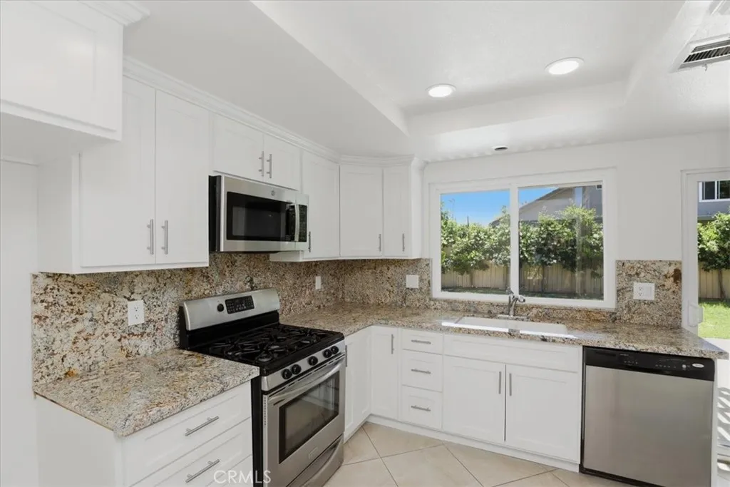This adorable "picture-perfect", sough-after single-story home, is a rare gem. Tucked away at the end of a charming cul-de-sac offers a rare sense of comfort and privacy. From the moment you arrive, the relaxing covered front porch invites you to sit back and stay a while. Inside, you'll love the "volume ceilings" offering a spacious feeling, ample windows offering plenty of light and consistent tile flooring throughout. A combined formal living and dining area offers plenty of versatility. Step into the cozy family room which is anchored by a classic arched entry and a brick-surround fireplace with a mantlethe ideal spot for quiet evenings. The kitchen is a cooks delight and as functional as it is charming, featuring "newish" white cabinetry complete with pull-out drawers and a lazy-Susan for effortless organization. Youll love the sleek stainless appliances and the beautiful granite countertops with a matching full-granite backsplash that makes cleaning a breeze. A sunny adjacent breakfast nook provides the perfect space for your morning coffee The primary suite offers a peaceful sanctuary with volume ceilings and a private slider leading directly to the backyard. The ensuite bath features a granite-topped vanity and a privacy door for the walk-in shower with custom tile surround. Two secondary bedrooms share an updated hallway bathroom, perfect for family or guests. An interior laundry room with updated upper cabinetry leads directly to the two-car garage for easy access. The charm continues outside with a covered backyard patio and an extended brick-trimmed area for soa