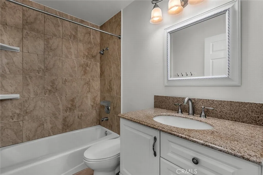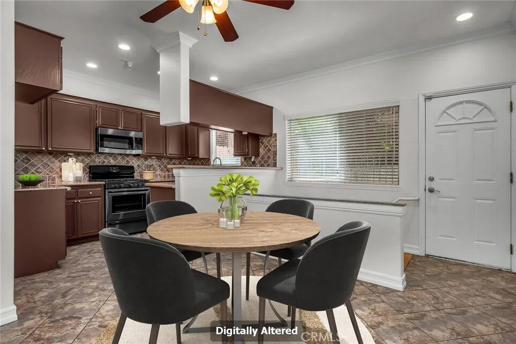 Stop the searchthis is the townhome youve been waiting for. Beautifully upgraded tri-level residence, quietly tucked at the back of the complex, blending comfort, style, and everyday convenience. Designed for modern living and effortless entertaining, this light-filled home features soaring ceilings, abundant natural light, and an open, airy layout throughout. The main level welcomes you with a spacious living room highlighted by high ceilings, crown molding, recessed lighting, wood-style flooring, and a cozy fireplace. A sliding glass door opens to a large private balconyperfect for morning coffee or evening relaxation. A convenient guest bathroom completes this level. The updated kitchen showcases warm Carmel-toned cabinetry, granite countertops, stone backsplash, stainless steel appliances, and decorative tile flooring, all opening seamlessly to a generous breakfast area ideal for casual dining. Upstairs, a decorative staircase leads to a versatile bonus areaperfect as a family room, home office, or media space. The expansive primary suite offers a peaceful retreat with a walk-in closet and an updated ensuite bathroom featuring a granite-top vanity and beautifully tiled step-in shower. The spacious secondary bedroom includes a mirrored closet and access to an updated hall bathroom with granite-top vanity and tub/shower combo. Both bedrooms enjoy direct access to a large, tranquil balcony, enhancing the indoor-outdoor flow. Additional highlights include a private two-car garage with washer and dryer, ample storage, and a well-maintained community featuring a pool, spa, an