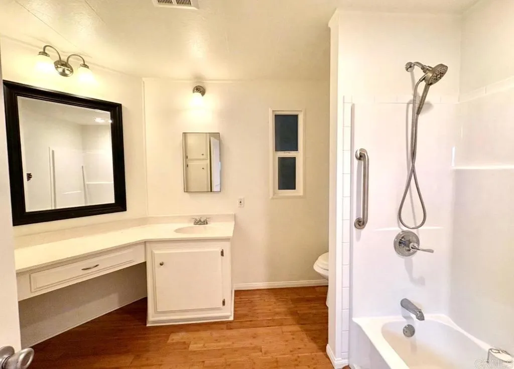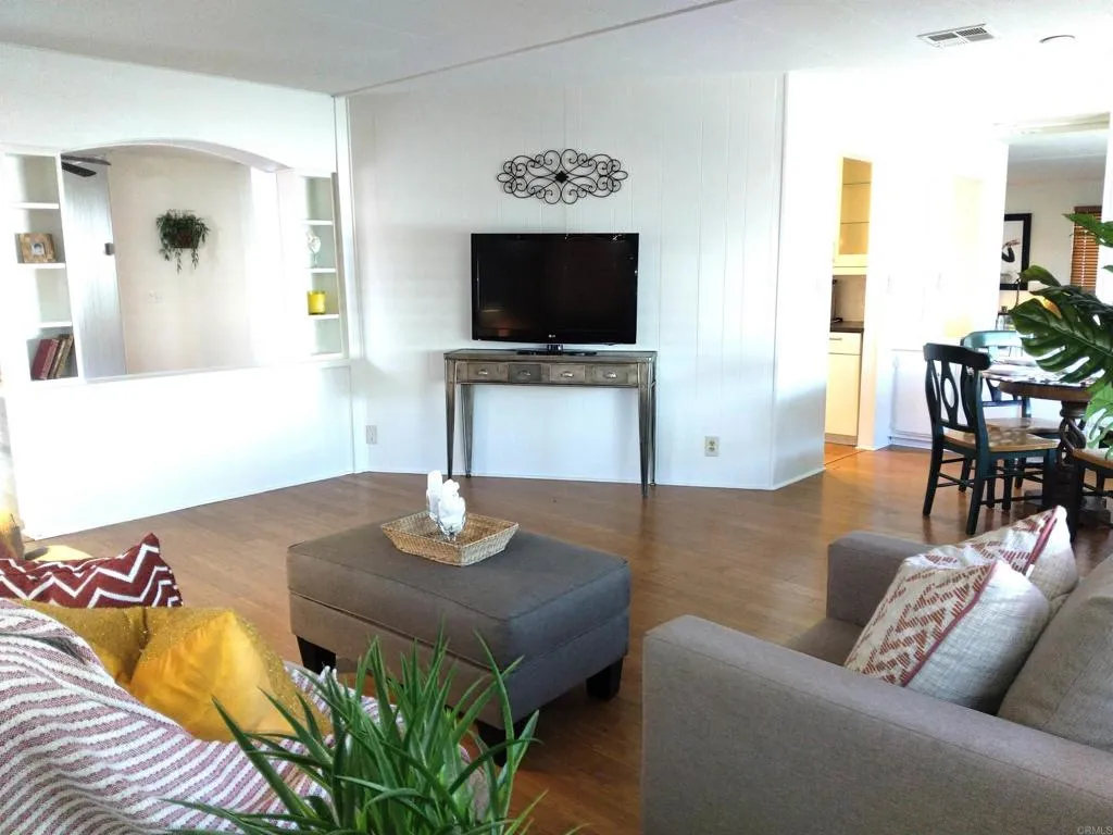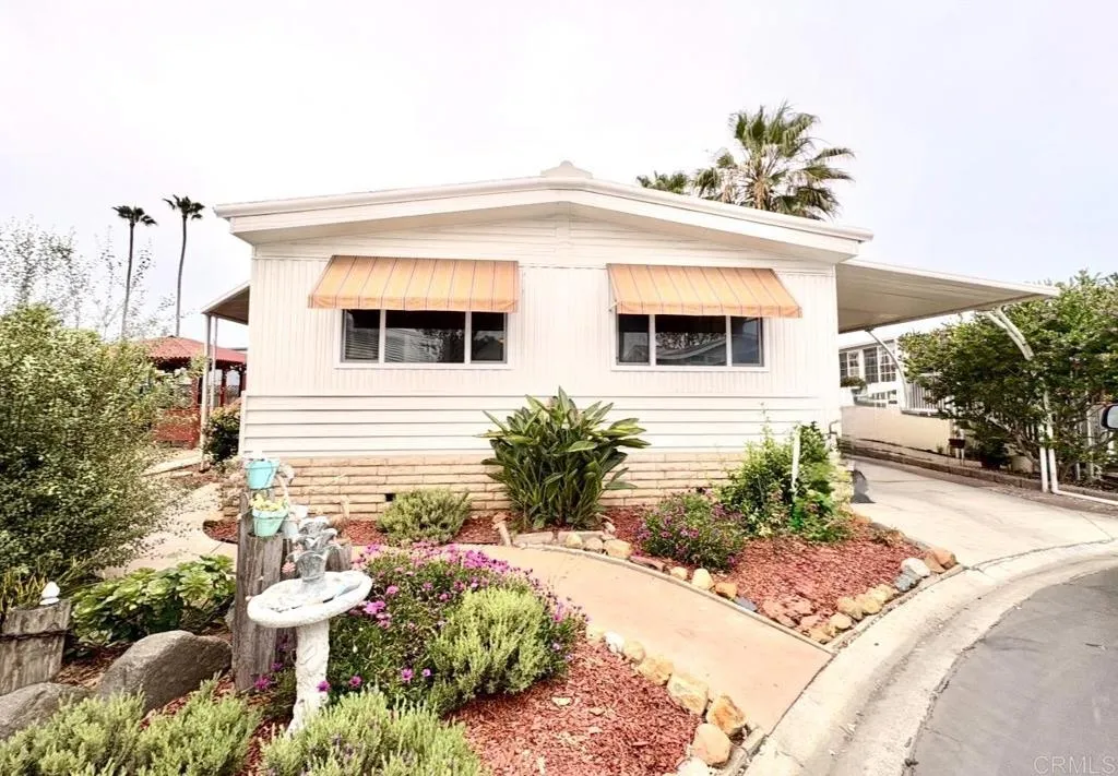 View of fountains and community lake in this updated 2-bed/2-bath home offering approx 1,440 sq ft of living space in the highly desirable, gated 55+ community of Lakeshore Gardens. Located west of I-5, just moments from the beach! The kitchen features crisp white cabinets, a farmhouse sinks plus stainless steel appliances! You will love bamboo look flooring and the beautifully updated bathrooms. Other upgrades include panel doors, ceiling fans, vinyl windows, and pretty French Doors to the bonus room. Step outside to enjoy a private gazebo, multiple seating areas and a large garden bed. Huge storage shed with workbench and washer and dryer convey. Freshly painted interior and ready for you to begin your coastal lifestyle! Carport area has ramp entry and there is a step in shower. Great location - close to everything! Call now! SN: S12645U/S12645X