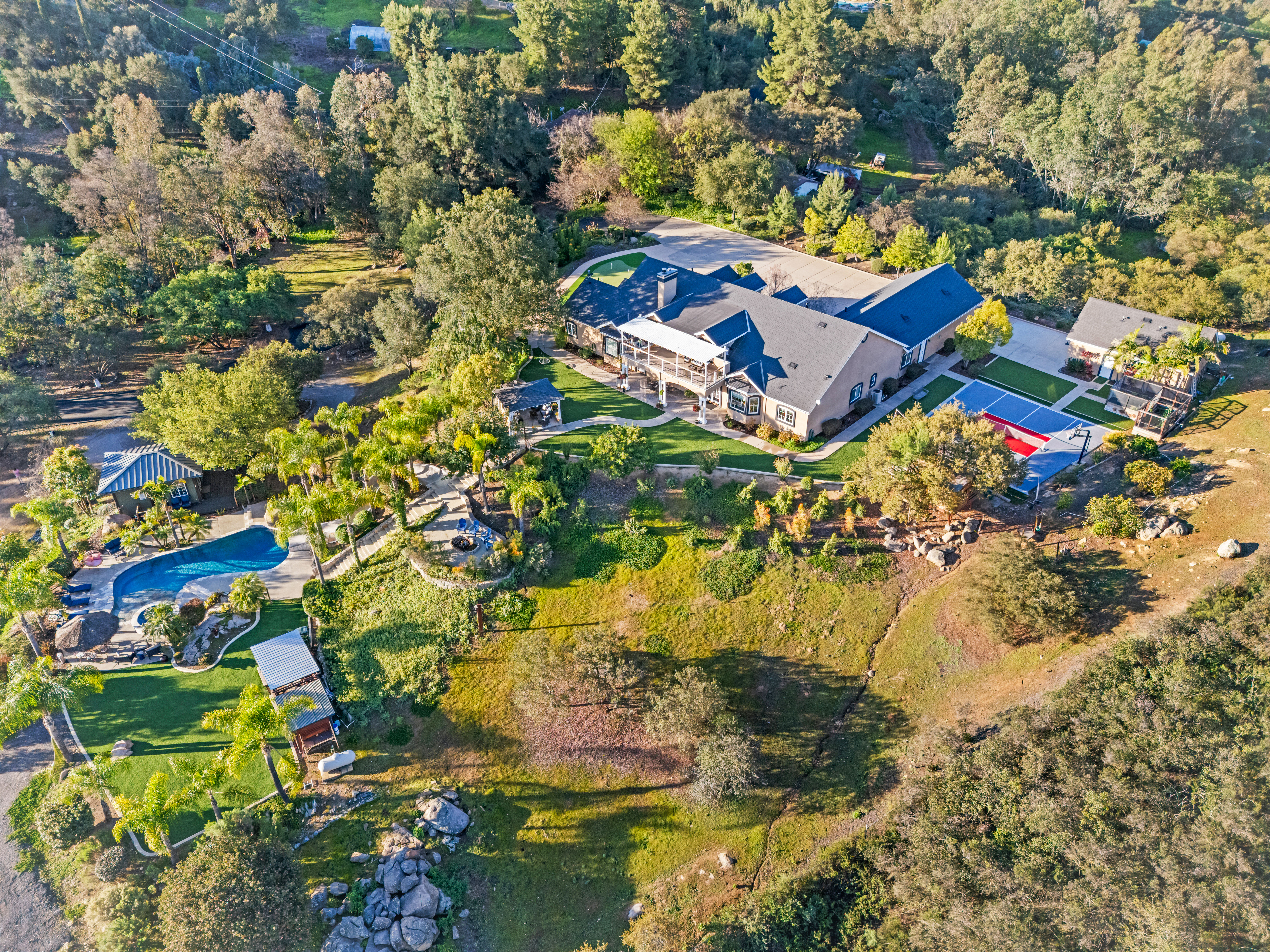 A True Legacy Property for Generations to Enjoy! Elegant and Timeless Estate Impeccably Maintained and Beautifully Designed and Curated, Located in Private Gated Community of Only Four Homes in Charming Park-like Settings. Beautiful Panoramic Views of Surrounding Hills, Privacy and Tranquility. Large Driveway Leads to Inviting Porch and Double Door Entry, Piano Room, Formal Dining Room and Huge Great Room with Fireplace. Chef's Kitchen Includes Alderwood Cabinets, Quartzite Counters and Backsplash, 48" Thermador Range, Walk-In Pantry, Breakfast Bar, Center Island, Custom Built-In Breakfast Nook and Your Kitchen Window Offers Picture Perfect Views. This Charming Home Lives Like a Single Story, with Four Spacious Bedrooms and Office on the Main Floor. Luxurious Primary Suite Includes Fireplace, Window Seat, Large Custom Walk-In Closet, Large Soaking Tub, Dual Sinks, Vanity, Walk-In Shower with Dual Shower Heads. Upstairs You'll Find Large Bonus/Theatre Room, Bunk Room with Four Beds, Bathroom, Large Storage Room and Oversized Balcony with Sweeping Views. This Truly Extraordinary Property Offers Resort Style Pool, with 50-Foot Waterslide, Large Spa, Reef, Custom Palapa, Multiple Patios, Custom-Built Timber Framed Guest House, BBQ Island with Wood-Burning Pizza Oven, Putting Green, Green House, Pickleball/Sports Court, True Treehouse, Zipline, Mature Fruit Trees, Majestic Oak Trees, Beautiful Landscape, Metal Carport for Tractors and Toys and Ample and Cleared Space for Horse Corral. The Main House Includes Oversized Four Car Garage with Epoxy Flooring. This One of a Kind Property also Offers Oversized Boat/RV Garage/Workshop. Countless Upgrades Include Open Floor Plan, High Ceilings, Paid Solar System with 24 Panels, Tankless Water Heaters, Central Vacuum, Smart House Features, Surrounds Sound, Alarm System, Australian Mahogany Flooring and Peruvian Travertine Tile. Enjoy your Private Oasis on Over Three Acres of Land! Enjoy Close Proximity - Walking Distance to Native Oaks Golf Club - Challenging 18-Hole Course with Gorgeous Tree Lined Fairways, Driving Range and Restaurant. Close Proximity to Valley View Casino and Interstate 15. Welcome Home!